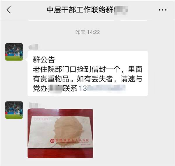 党办工作人员通过群发消息询问后,终于找到了信封的主人,失主正是肺二科护士徐成玲。原来,徐成玲当时着急赶往会议室参加护理人员继续教育,路过住院部门口的时候,从口袋里拿手机时不小心把装着现金的信封也带出来了,根本没有注意到居然掉落了。